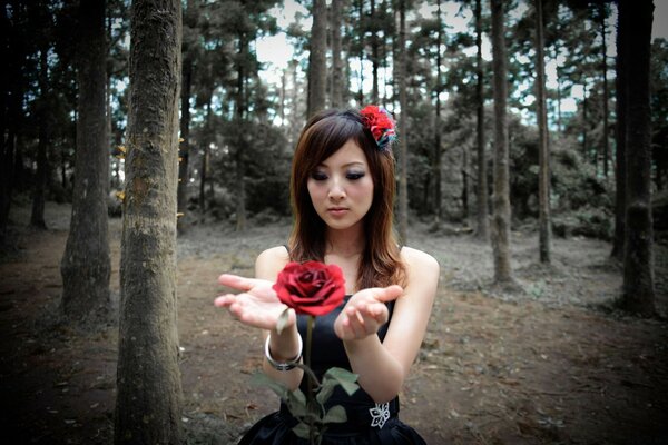Dziewczyna w lesie czaruje różę