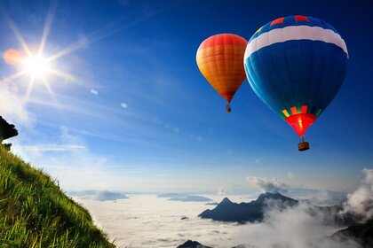 Balony unoszą się nad górami na tle czystego błękitnego niebaBalony unoszą się nad górami na tle czystego błękitnego nieba