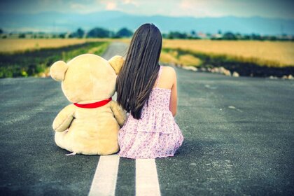 Dziewczyna i miś na drodze z dwoma pasami