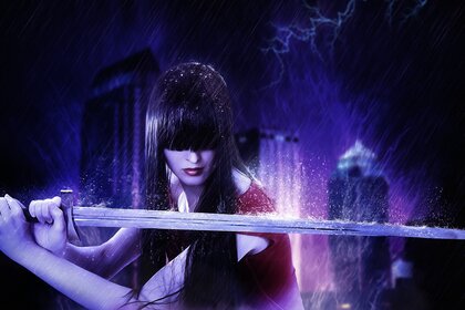 Niesamowita dziewczyna, która trzyma miecz na pięknym tleNiesamowita dziewczyna, która trzyma miecz na pięknym tle