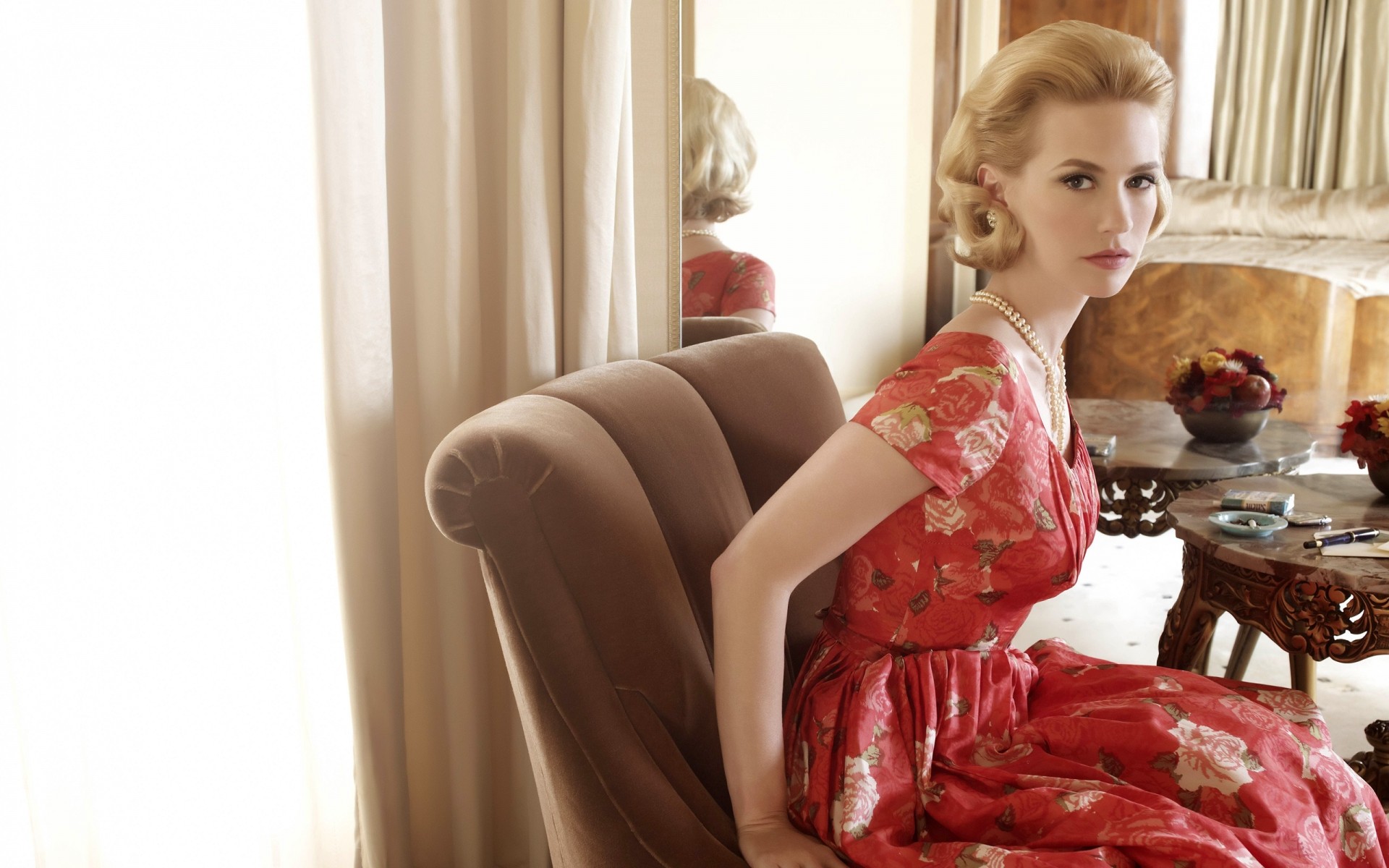 Dorosła kobieta w czerwonej sukience w pokoju siedzi na meblach