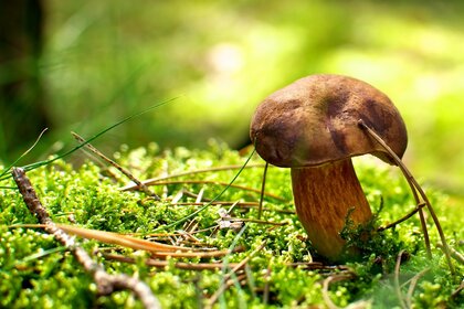 Samotny grzyb w zielonych liściach