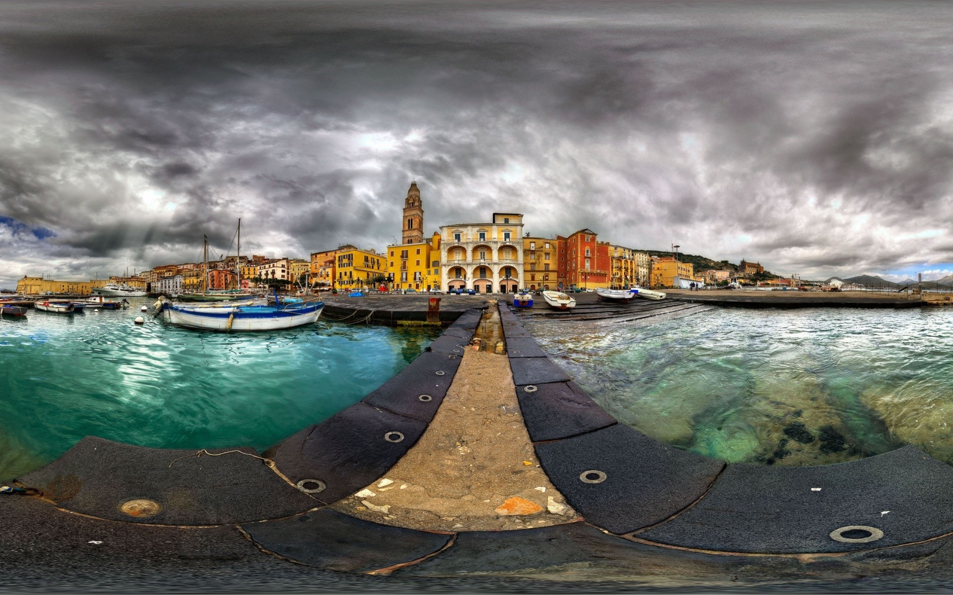 Przystań z łodziami i jachtami w mieście - tapety na pulpit