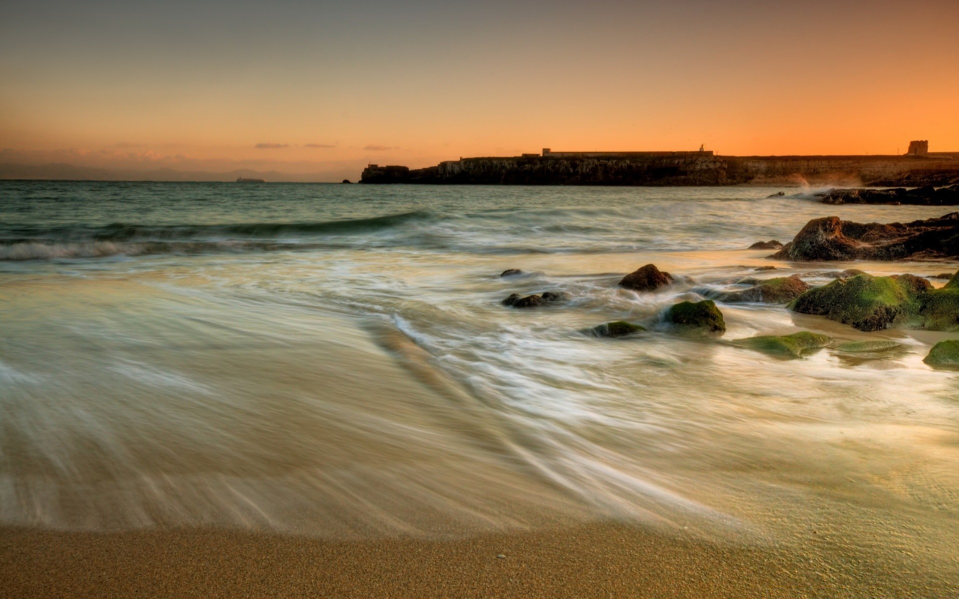 Piękny krajobraz morski z falami, kruchym piaskiem i spadzistymi kamieniami - tapety na pulpit