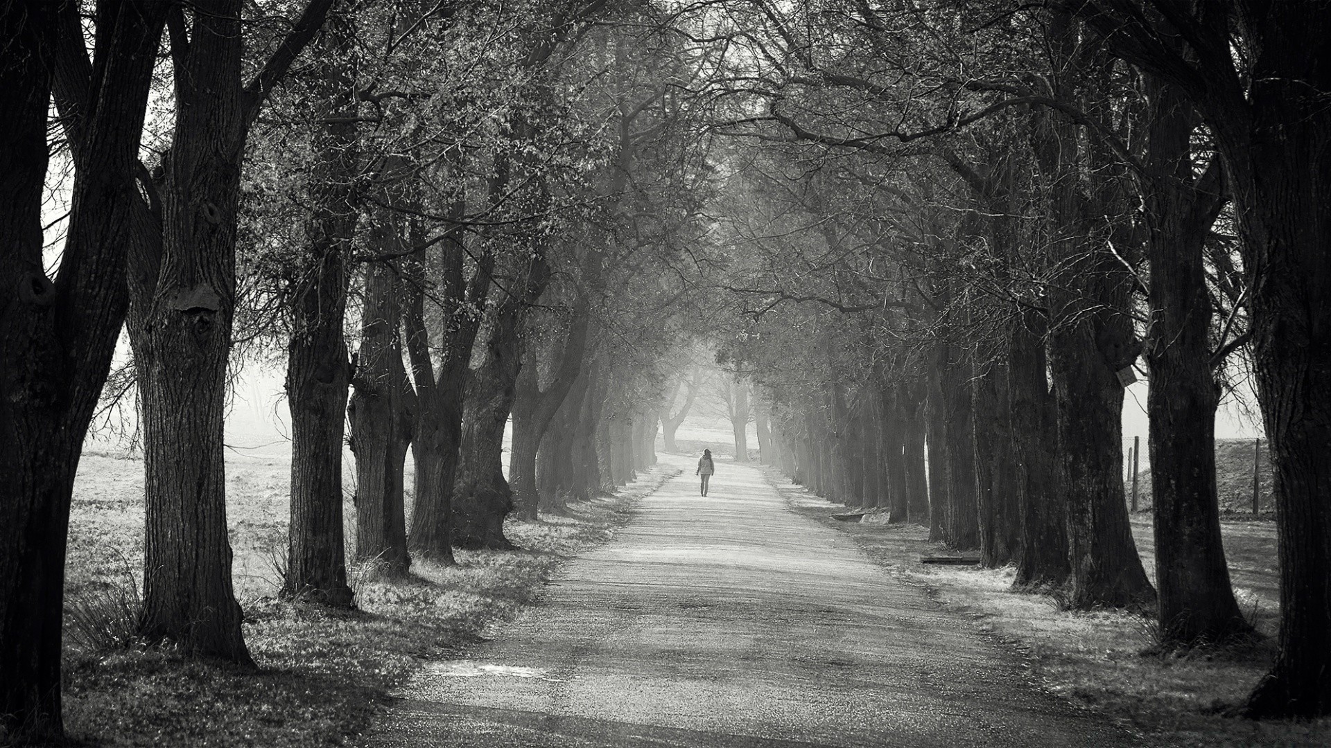 Tagi:czarno-białe, drzewo, mgła, krajobraz, mgła, droga, zima, drewno, przewodnik, aleja, śnieg, monochromatyczny, park