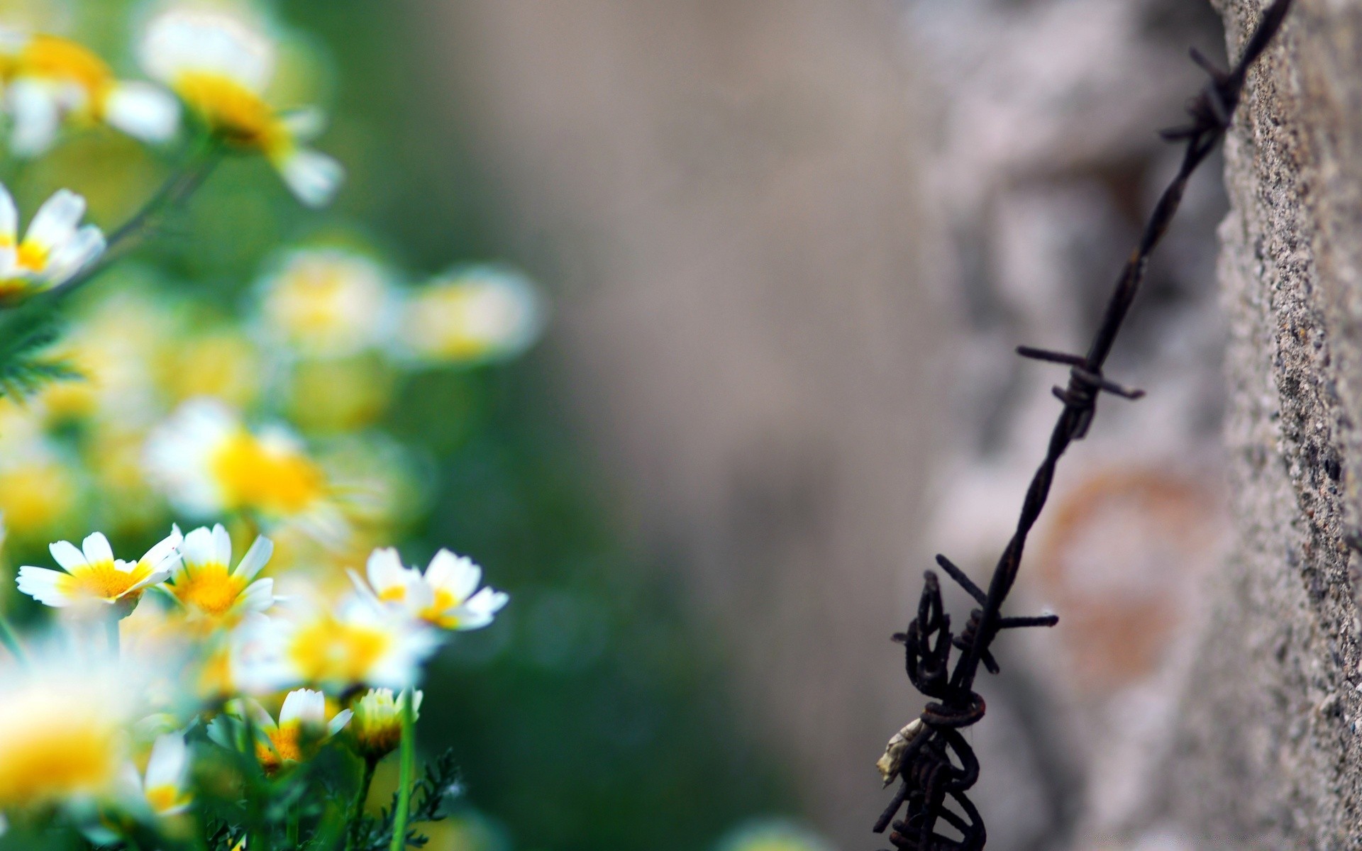 Drut kolczasty i białe stokrotki - tapety na telefon