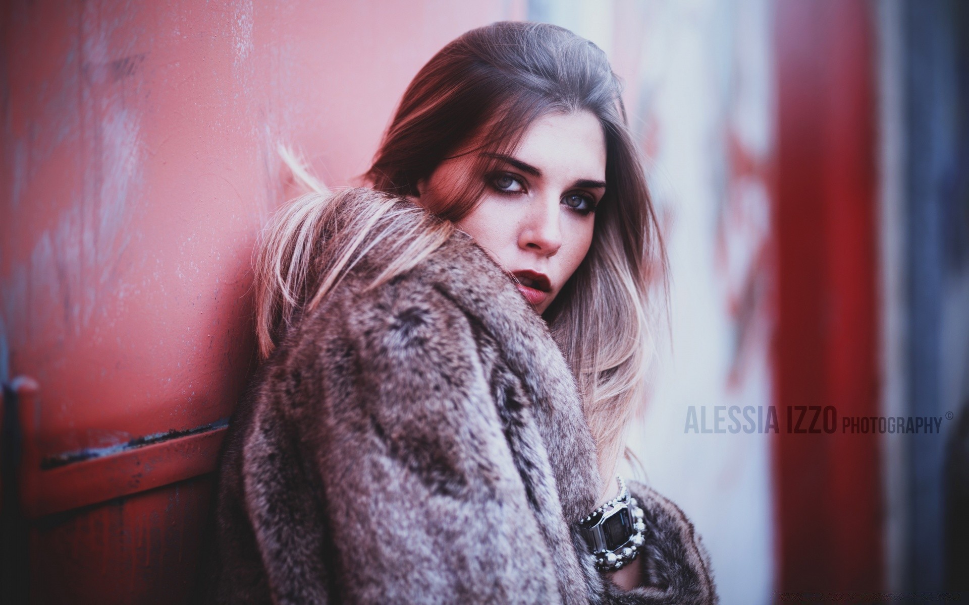 Portret dziewczyny w futrze przy ścianie