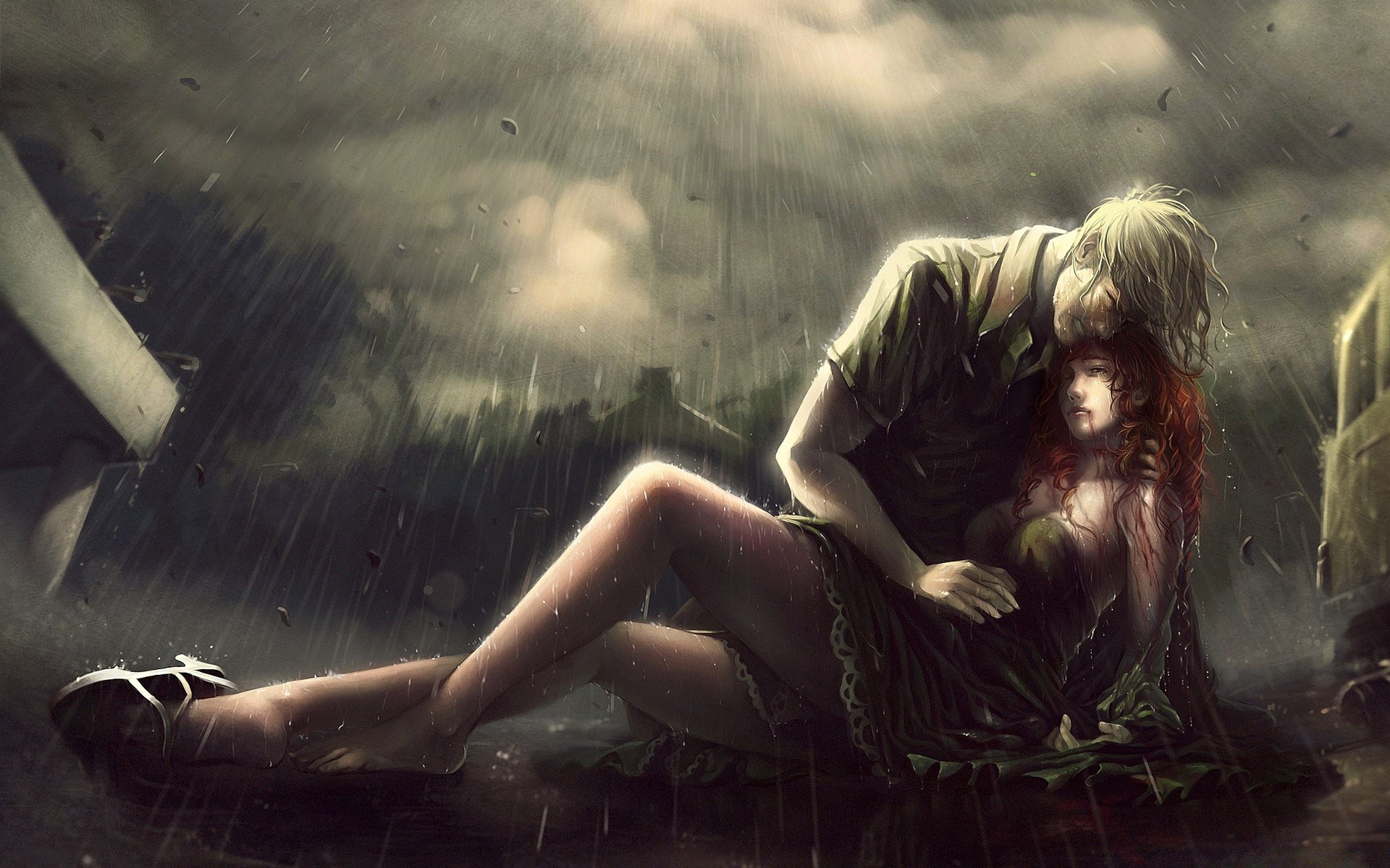 Mężczyzna przytula kobietę w deszczu