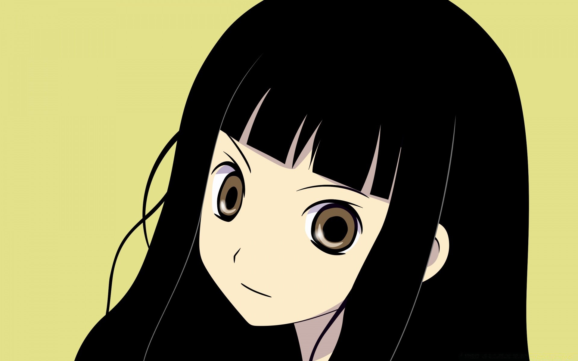 Dziewczyna z czarnymi włosami i dużymi oczami. Rysunek. Anime