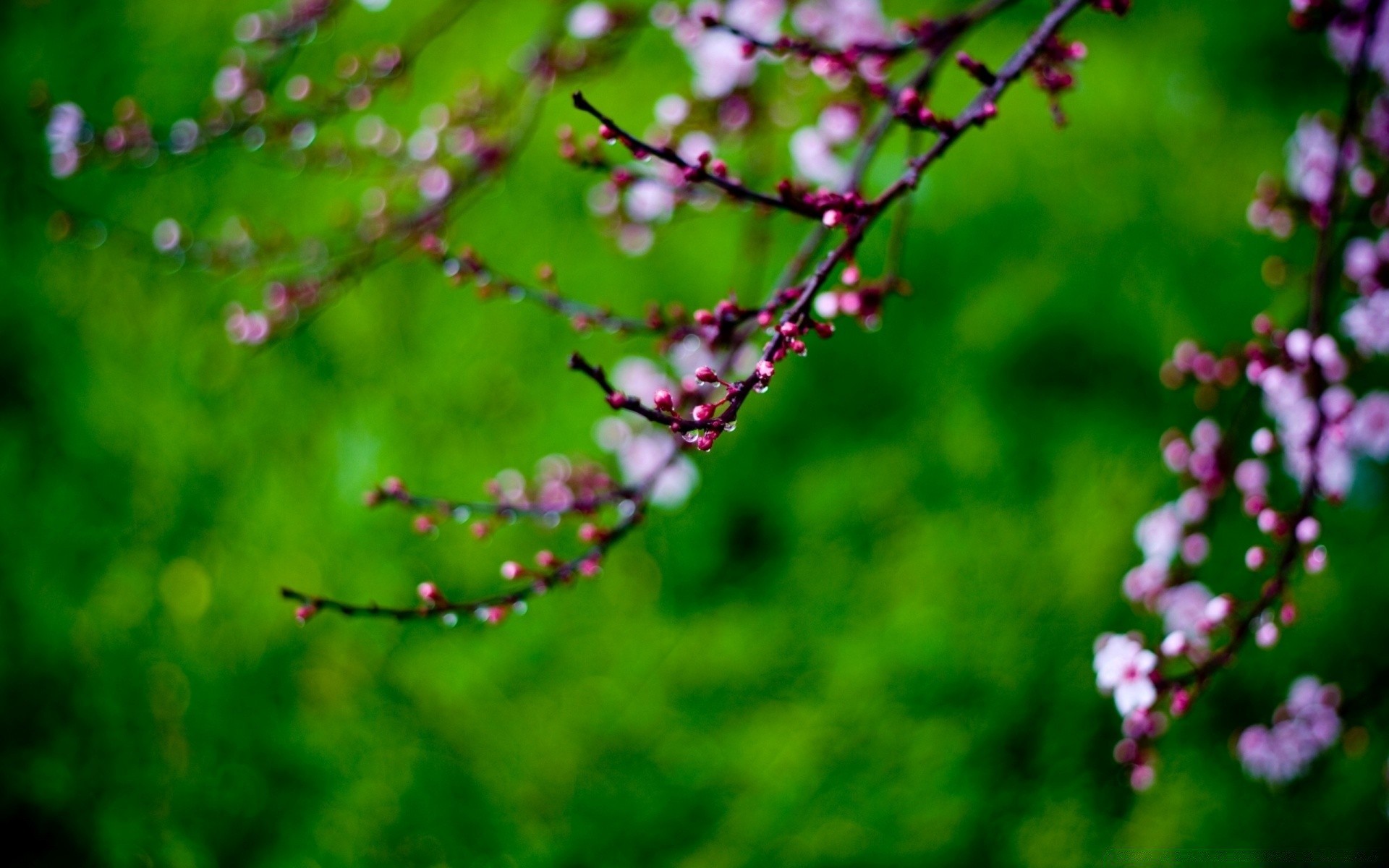 Pojedyncza kwitnąca gałąź na zielonym, rozmytym tle
