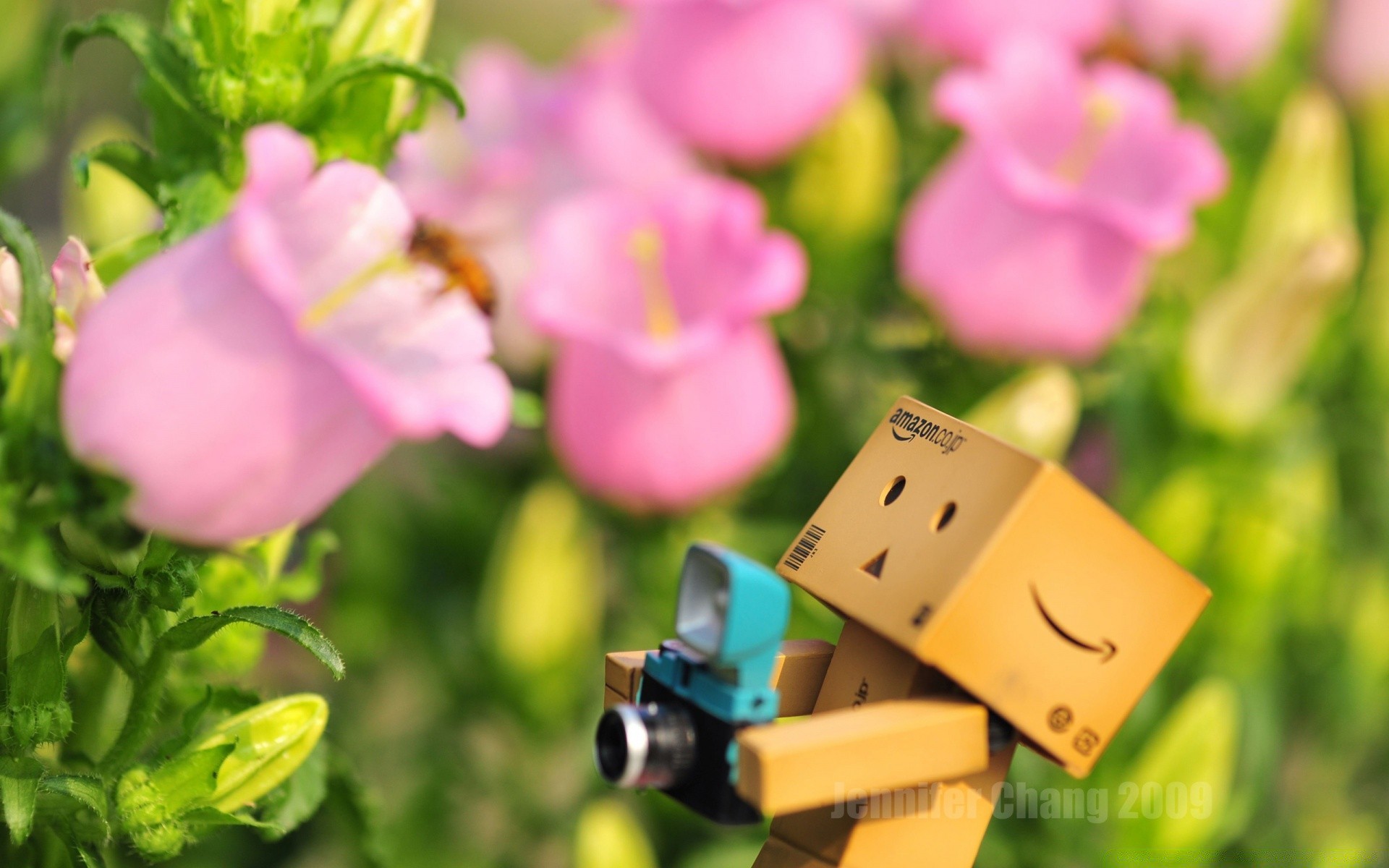 Mały człowiek z pudełek fotografuje kwiaty