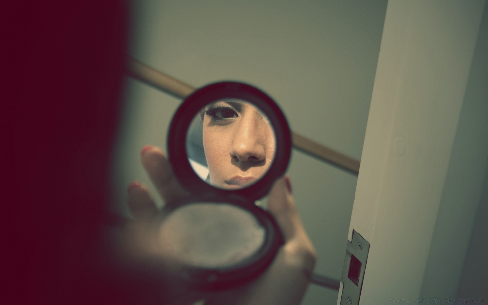 Zdjęcie odbicia kobiety w kieszonkowym lustrze