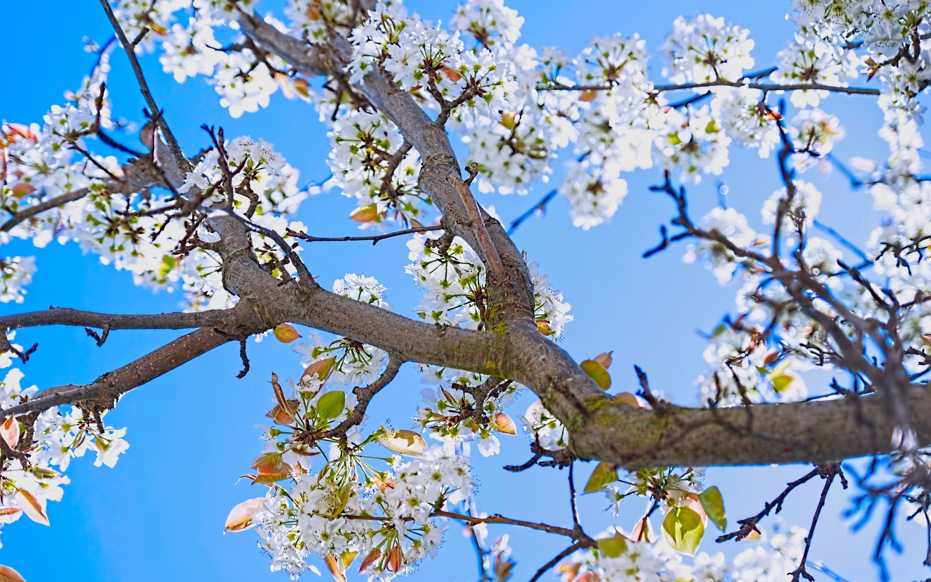 Kwitnące drzewo wiśni. Drzewo różane na tle nieba