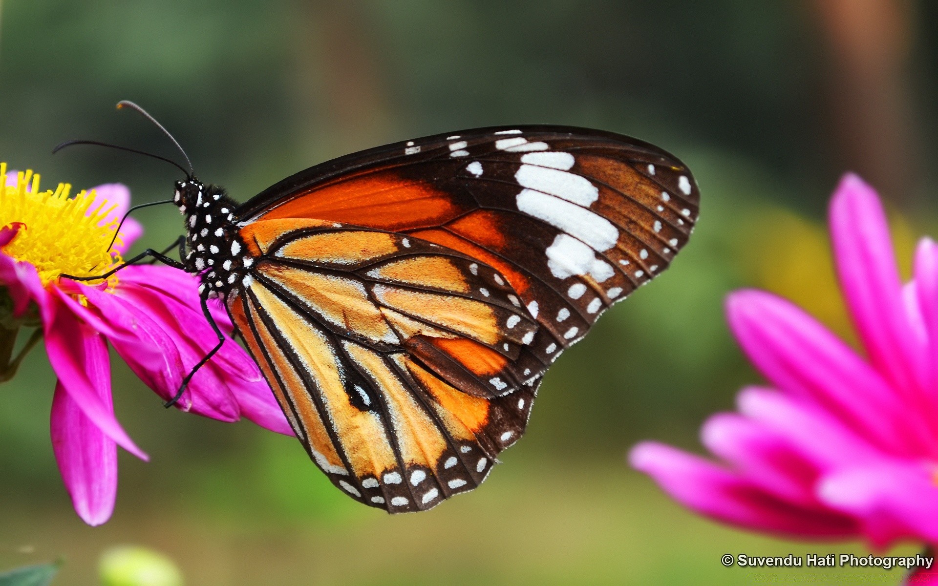 Cętkowany motyl na różowym kwiatku