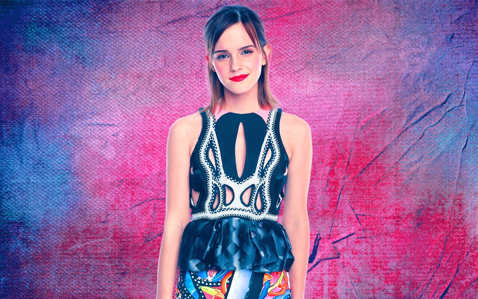 Piękna kobieta na kolorowych fototapetach