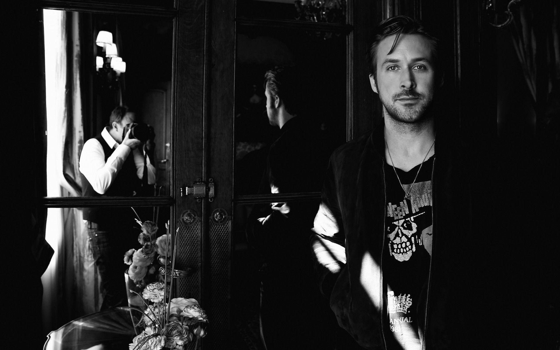 Aktor w nieformalnych ubraniach na zdjęciu w czerni i bieli