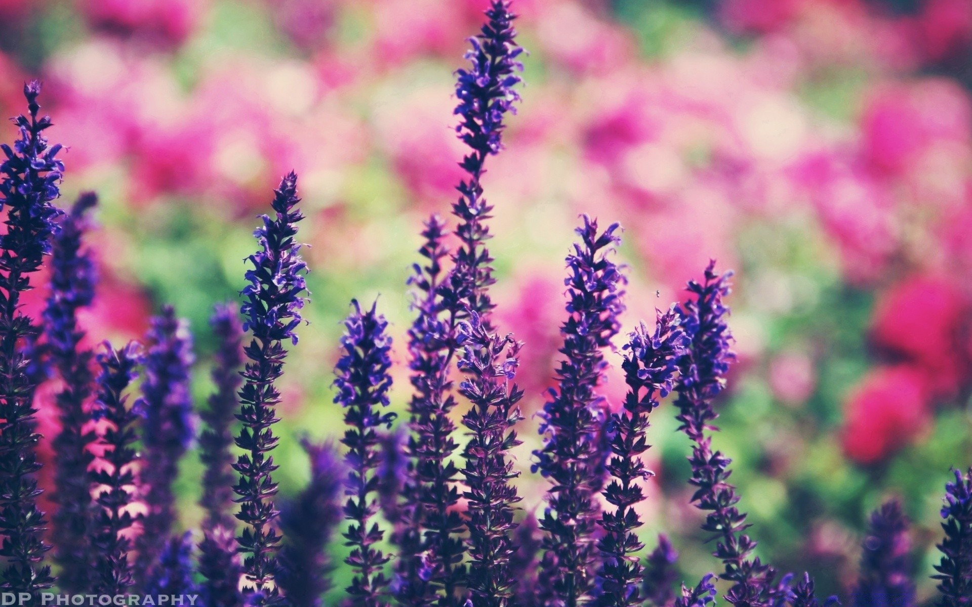 Feoletowe kwiaty na rozmytym tle kwiatów