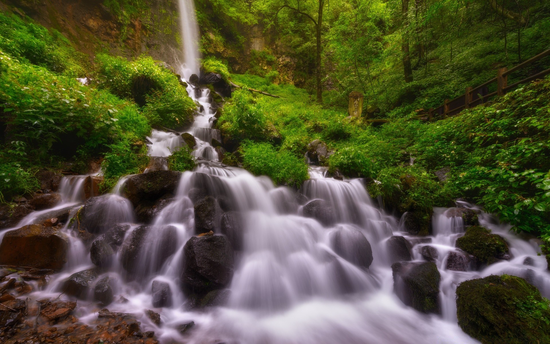 Dziewczyna leży w czerwonej sukience na kamieniu obok wodospadu