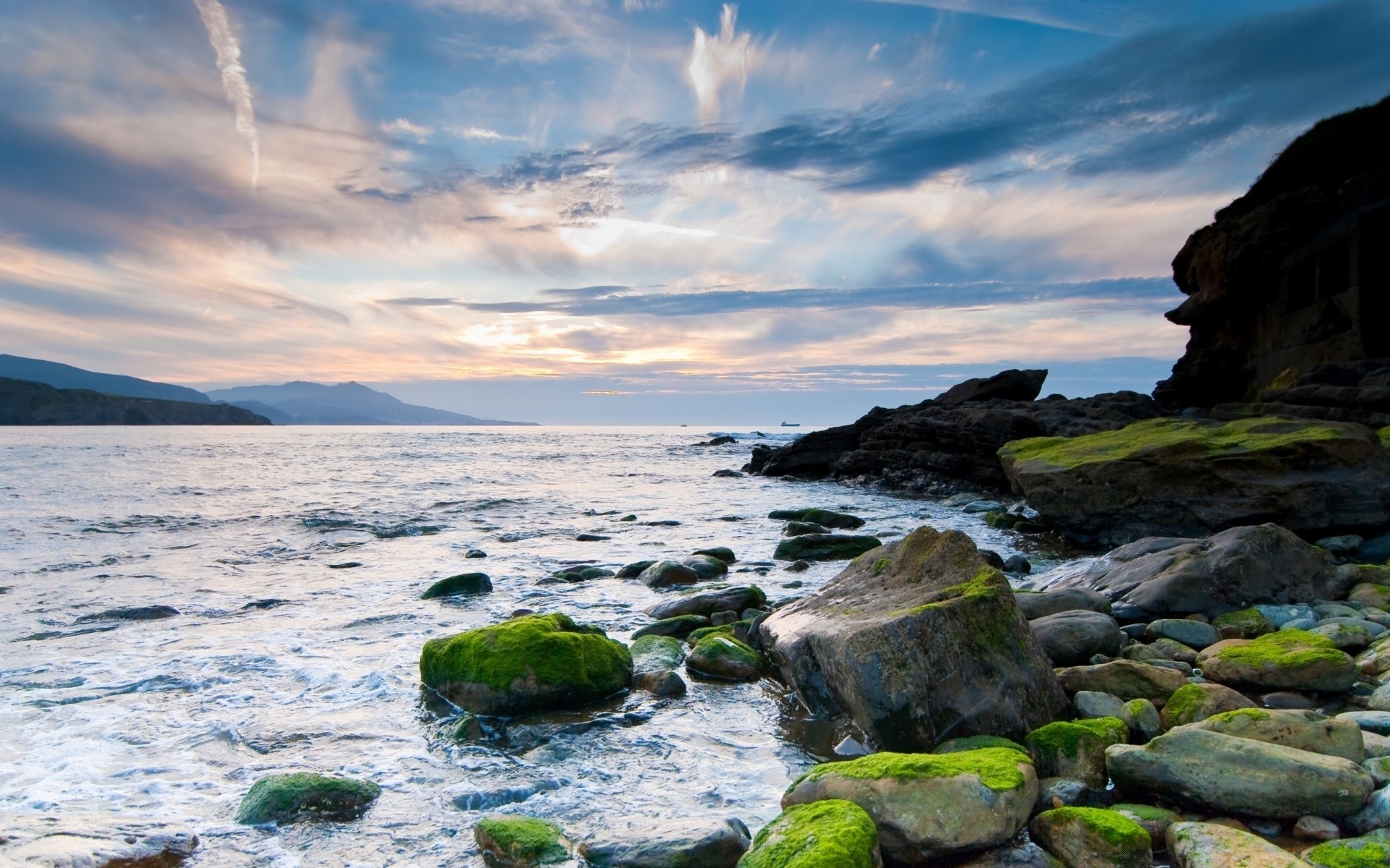 Piękny zachód słońca na skalistym brzegu morza