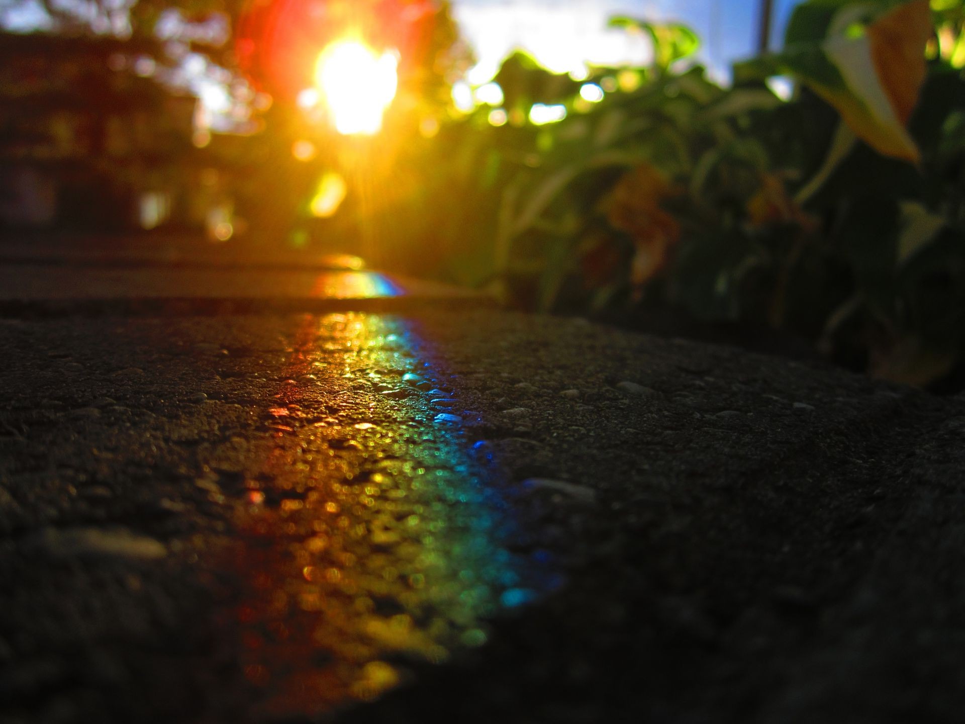 Światło słoneczne przedziera się przez liście o zachodzie słońca