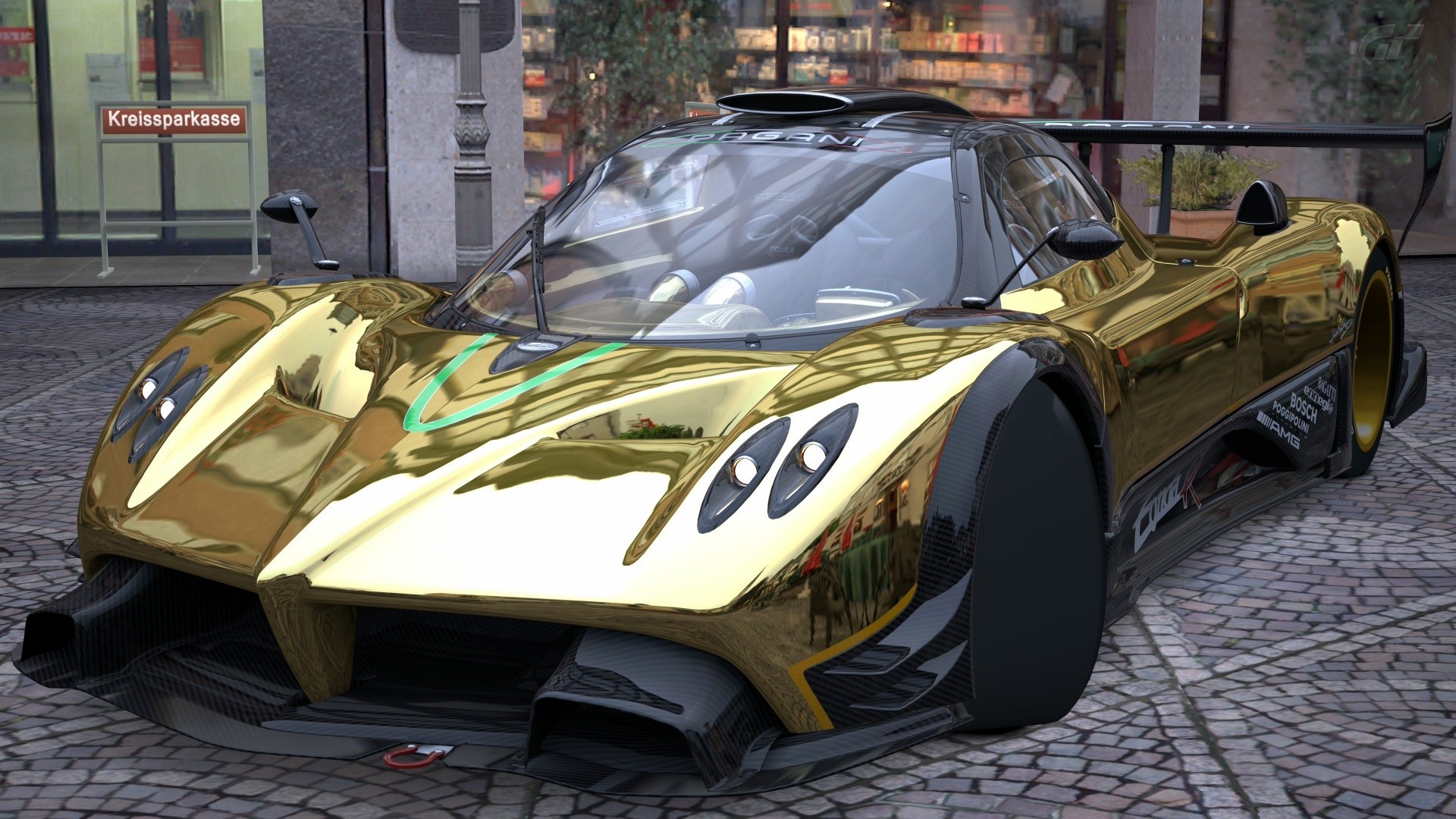 Samochód wyścigowy w kolorze złotym przed kawiarniąSamochód wyścigowy w kolorze złotym przed kawiarnią