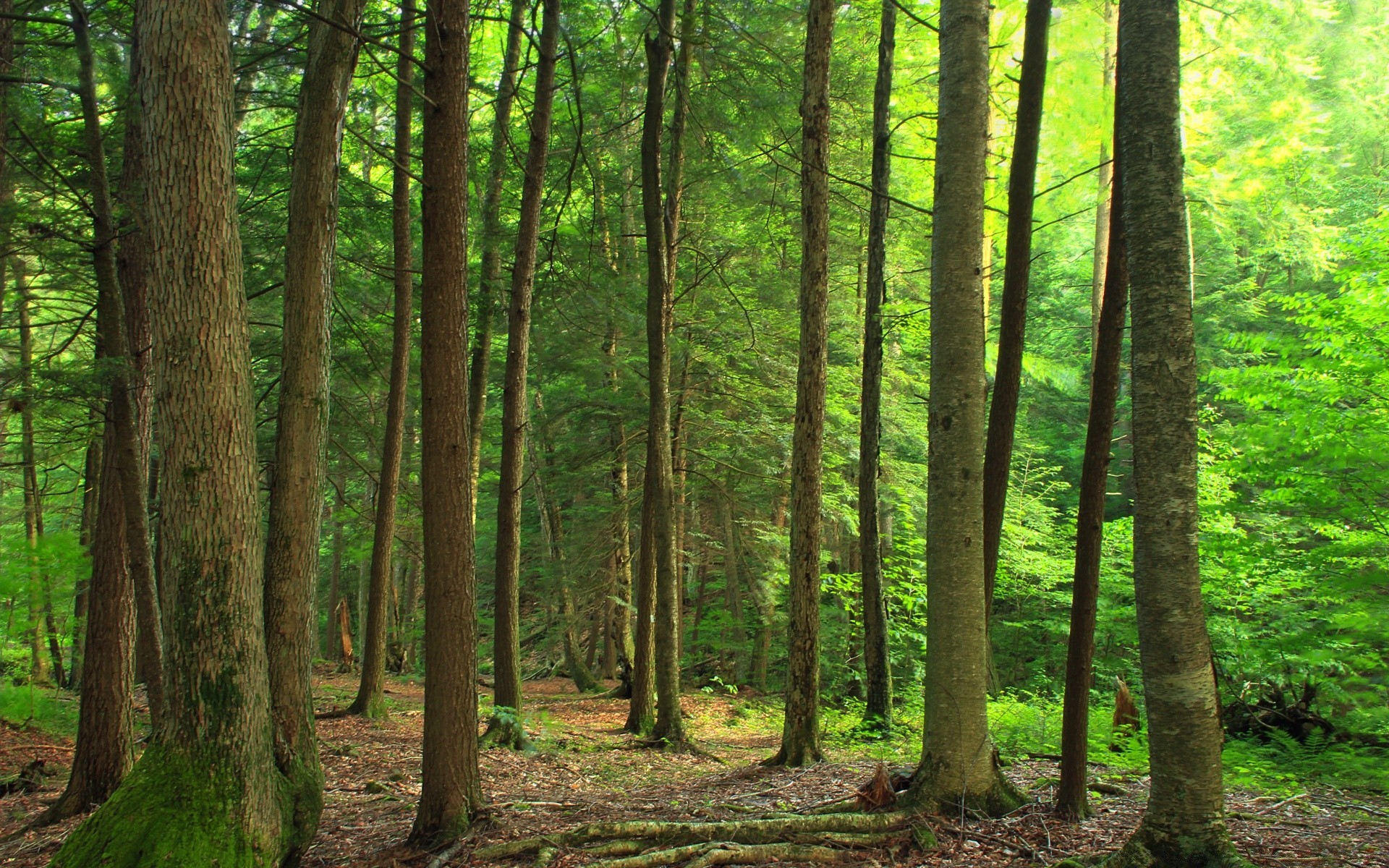 Drzewa z prostymi, równymi pniami w zielonym lesie