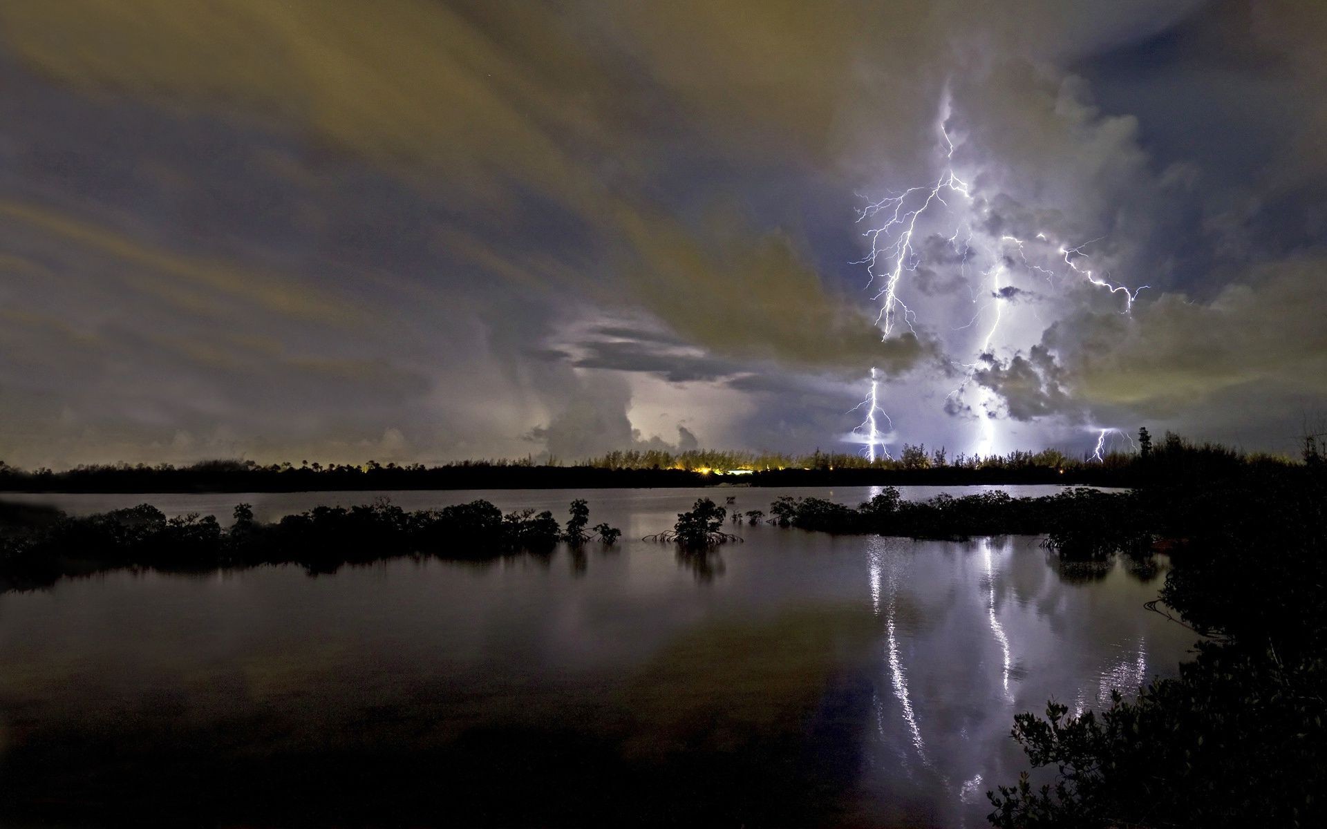 Świt i błyskawica to urzekający krajobraz nad wodą