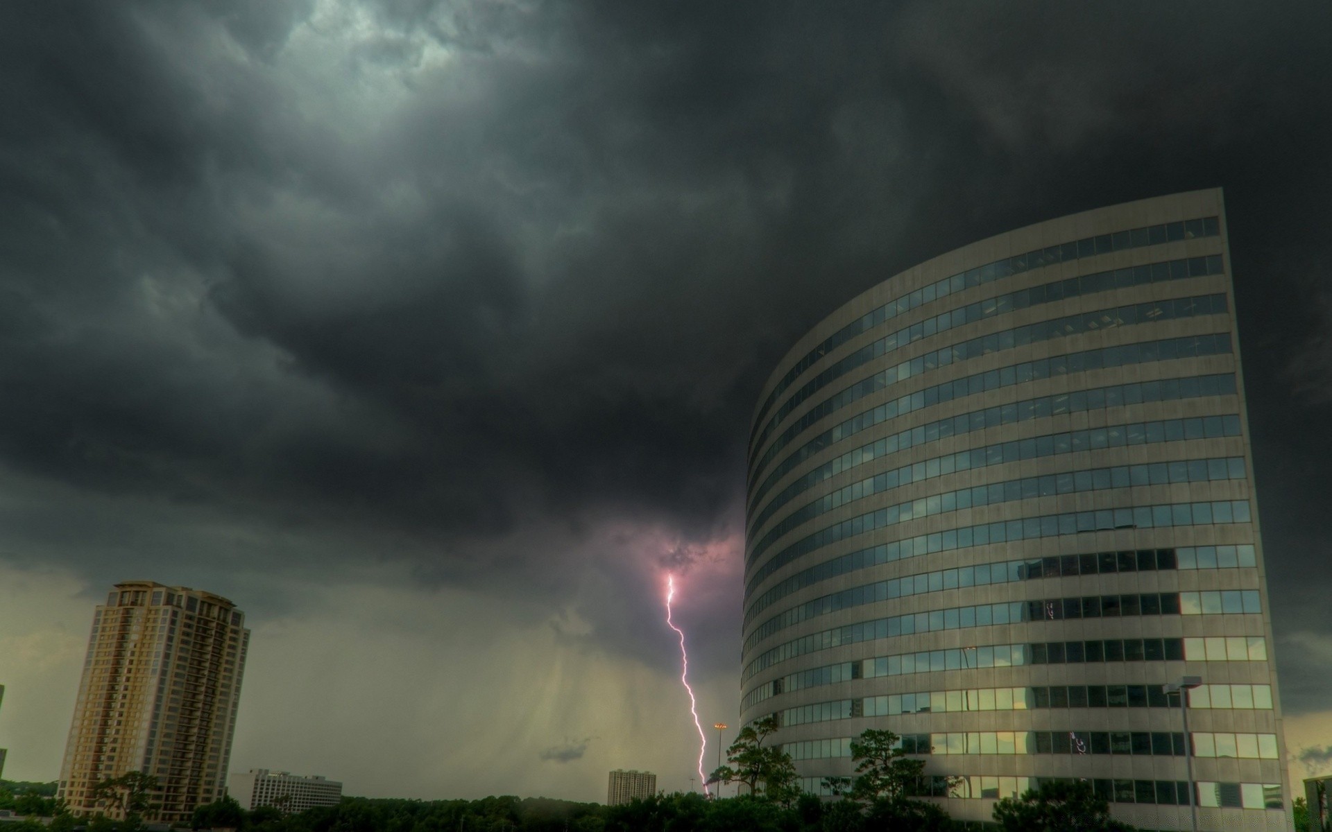 Budynek z lustrzanymi oknami w chwili niebiańskiej błyskawicy