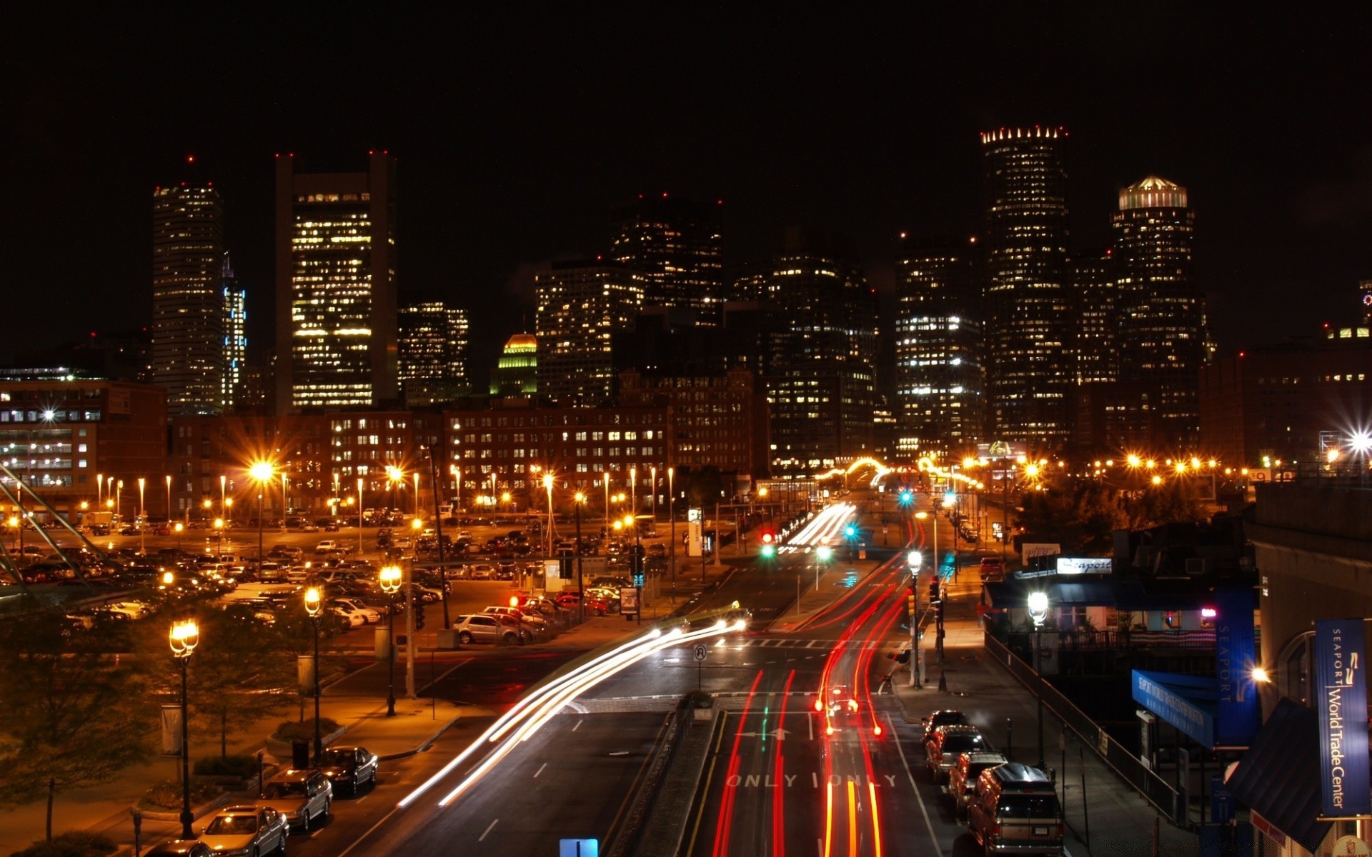 Miasto w Ameryce wieczorem kolorowo oświetlone