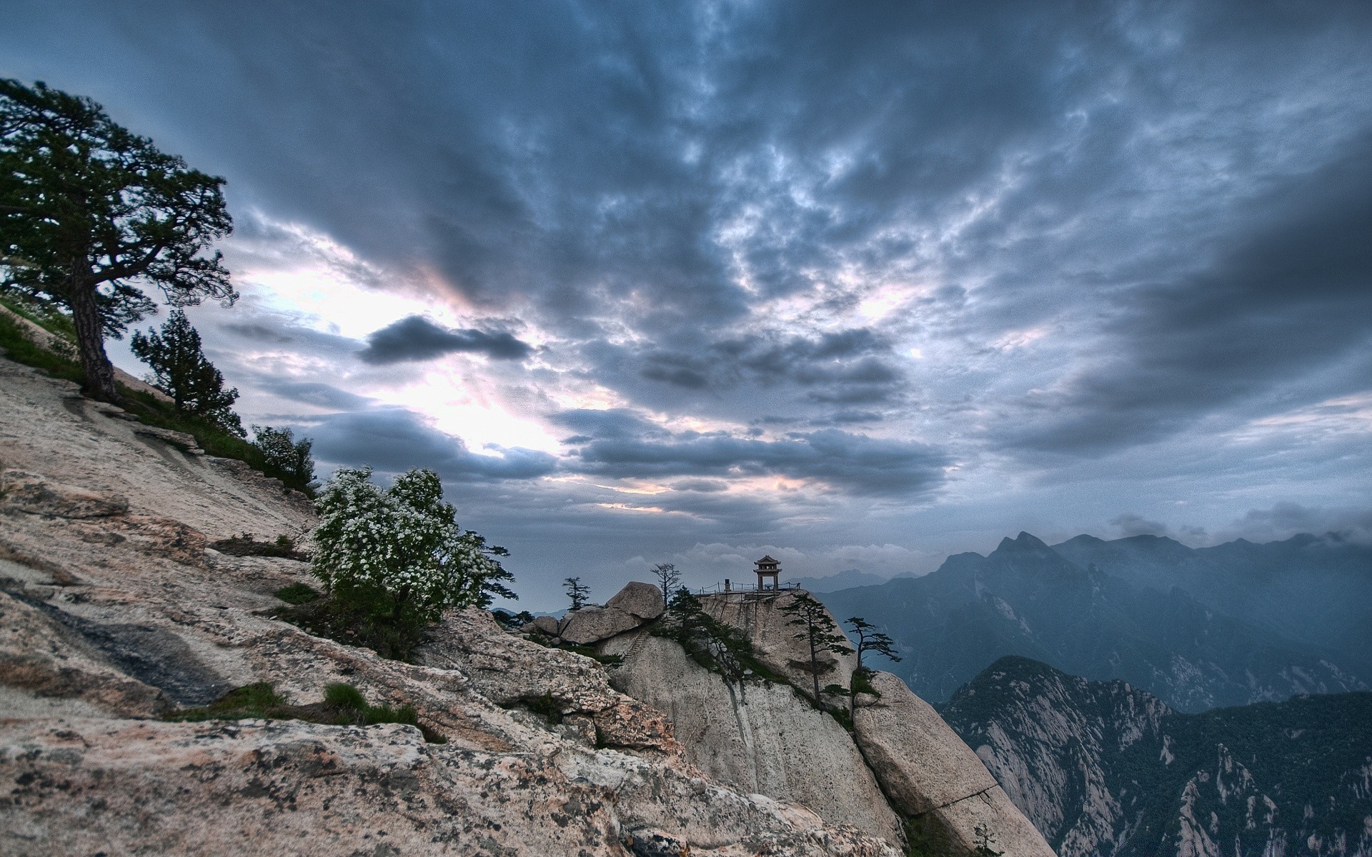 Ogromny cień samotnego drzewa o zachodzie słońca