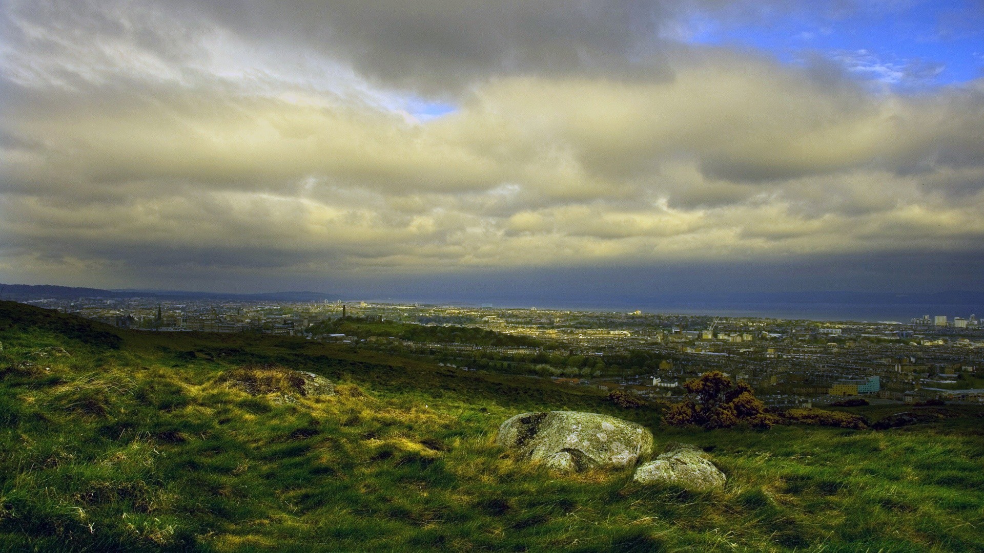 Sylwetka futurystycznych budynków na tle ognistego zachodu Słońca