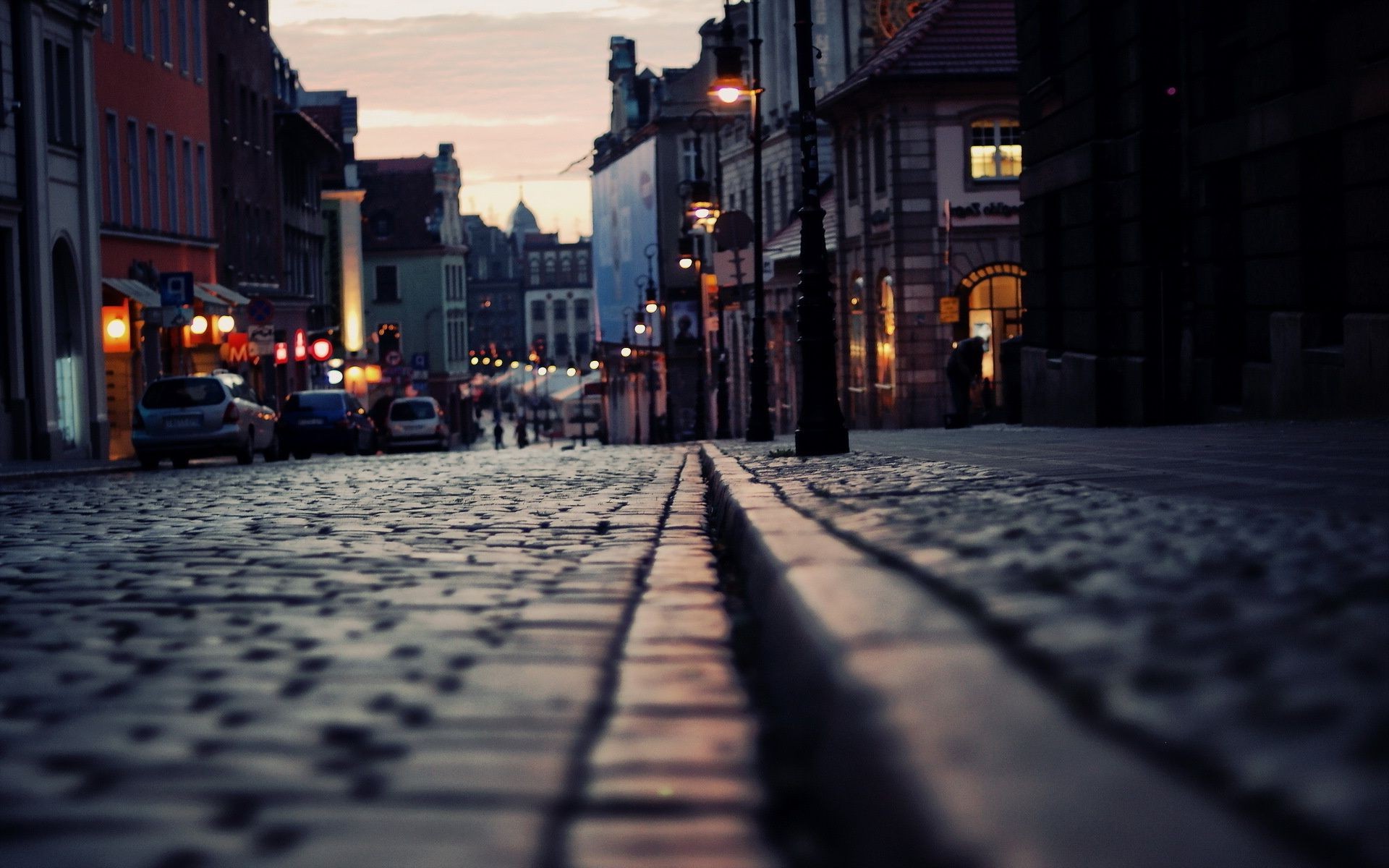 Do miasta przychodzi poranek, droga pusta na chodniku rzadcy przechodnie w jesiennych promieniach słońcaDo miasta przychodzi poranek, droga pusta na chodniku rzadcy przechodnie w jesiennych promieniach słońca