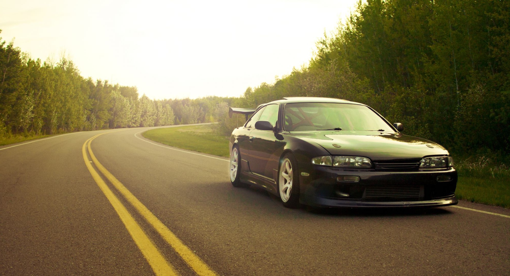 Czarny samochód wyścigowy w deszczu przy drzewie
