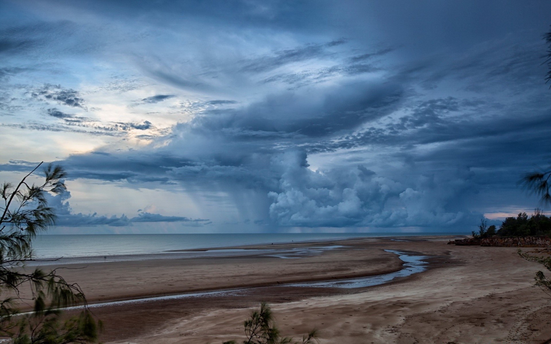 Wieczorne niebo odbija się w jeziorze promieniami słońcaWieczorne niebo odbija się w jeziorze promieniami słońca