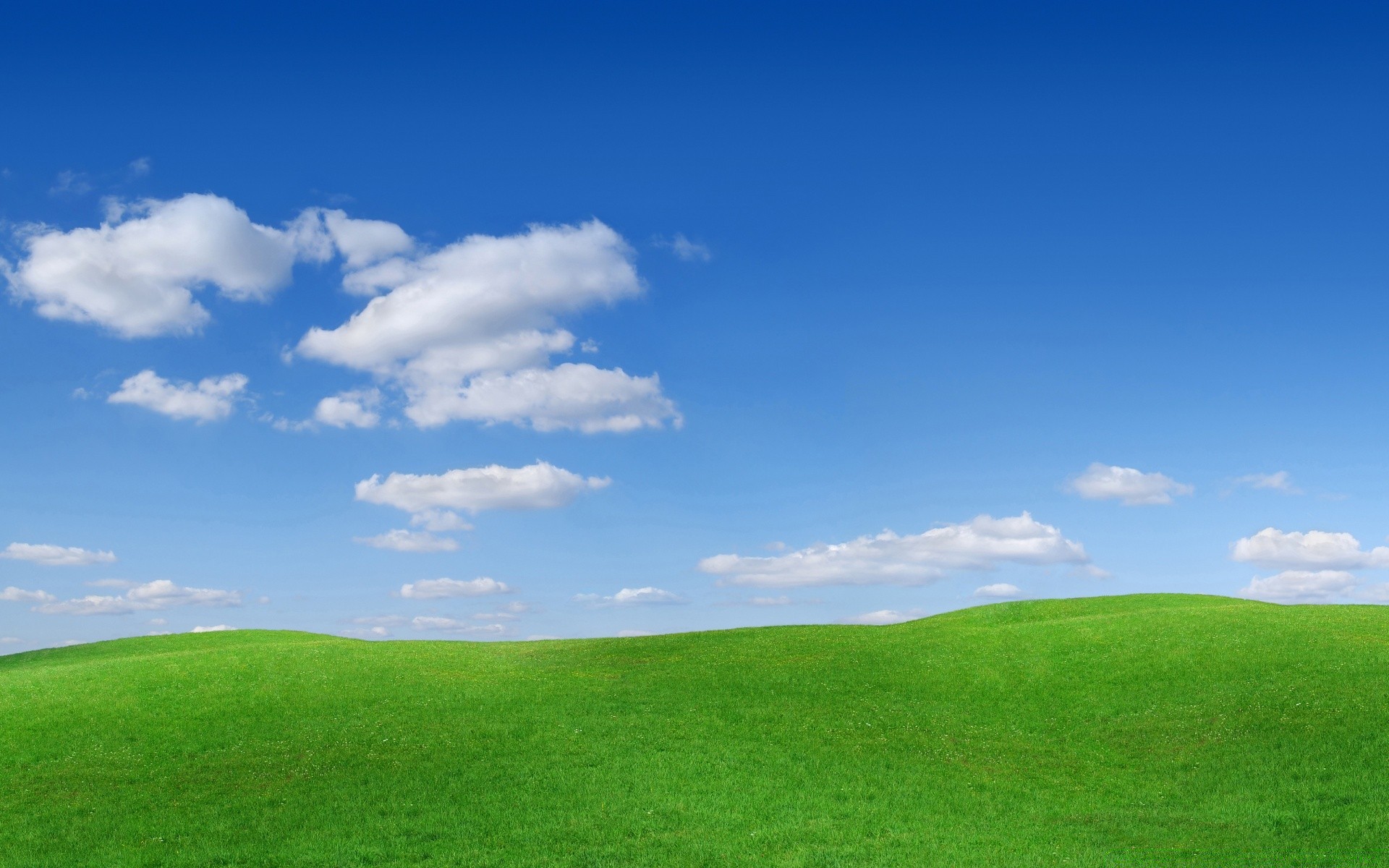 Błękitne niebo z białymi chmurami nad jasnozieloną trawą