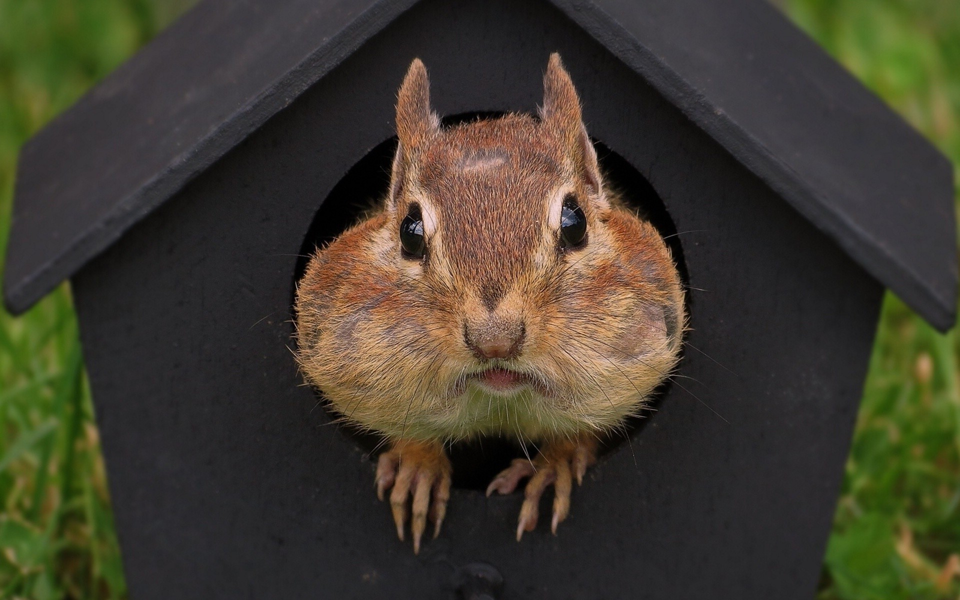 Rudy gryzoń wychylił się z budki dla ptaków