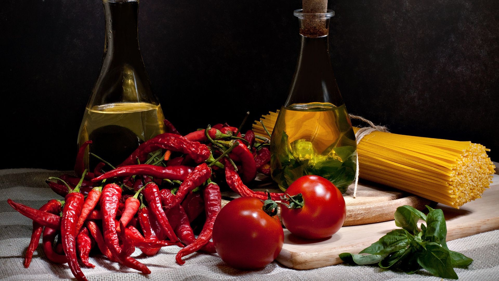 Zestaw dla smakoszy. Pomidory, chili i oliwa z oliwek