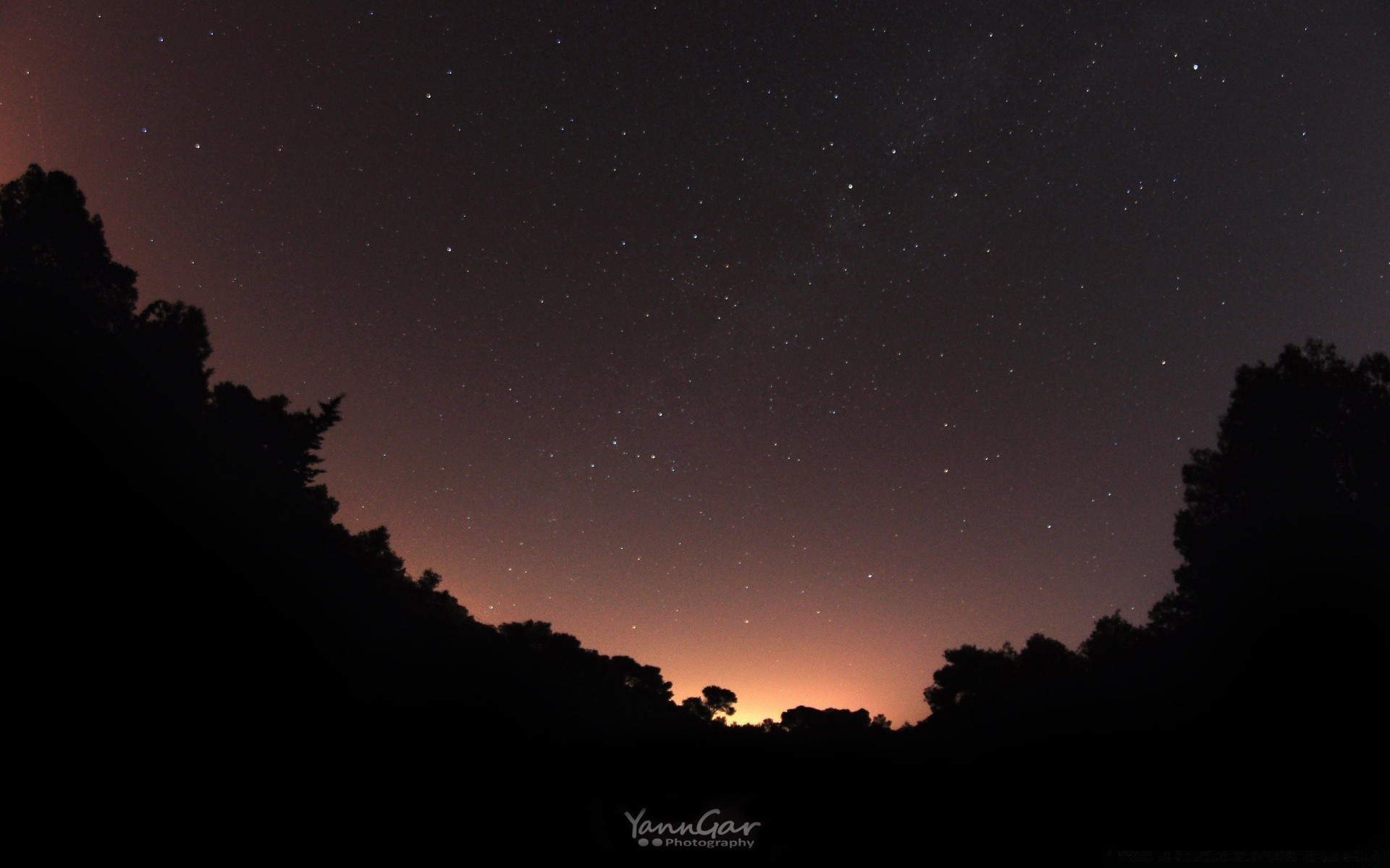 Gwiaździste niebo o zmierzchu zaczarowanego lasu