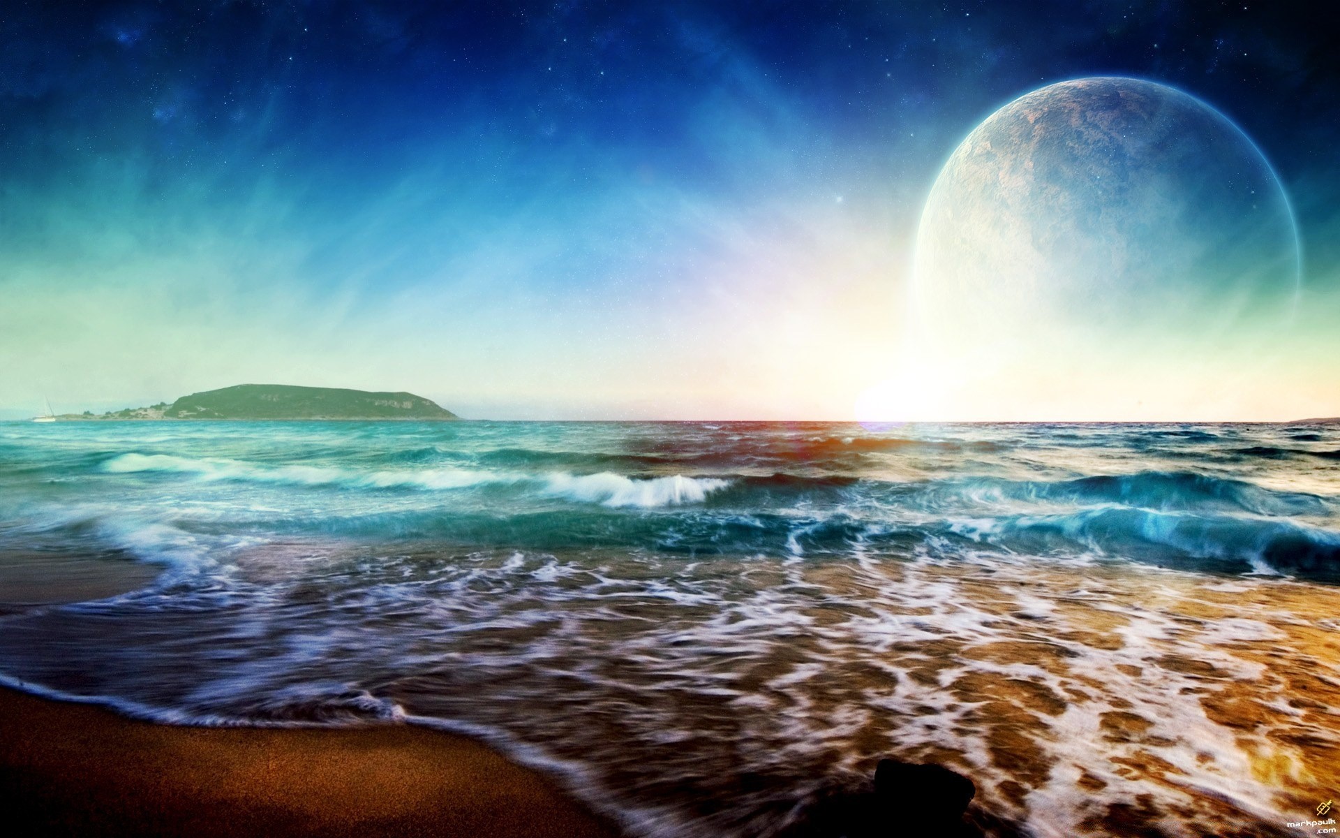 Przypływ do morza z jasnym tłem nieba z nieznaną planetą