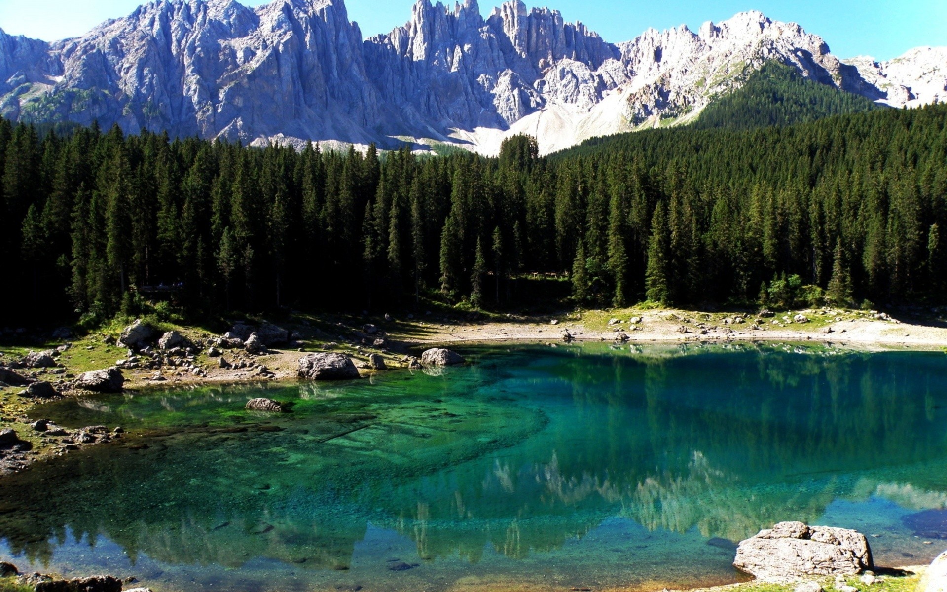 Fotopejzaż przedstawiający przezroczysty staw wśród kamieni na tle wysokiego lasu iglastego i gór
