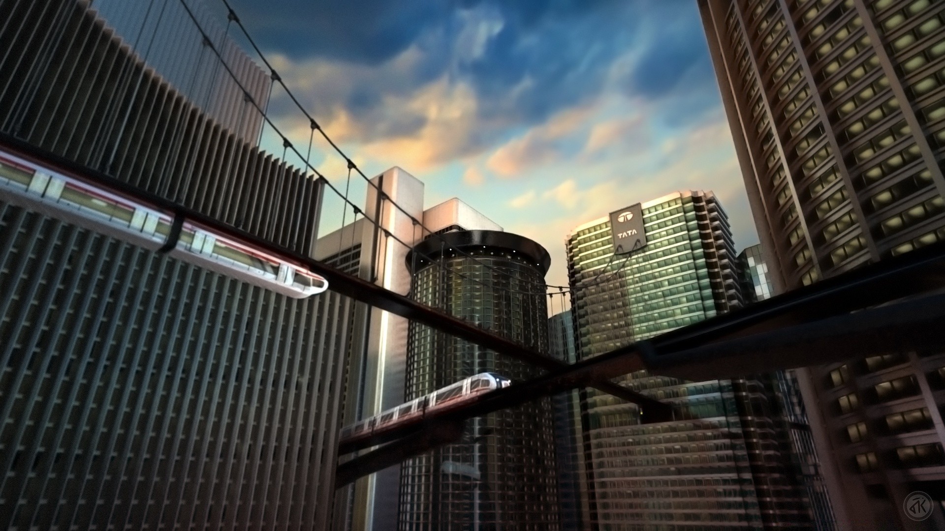 Most z jadącym pociągiem w pejzażu miejskim