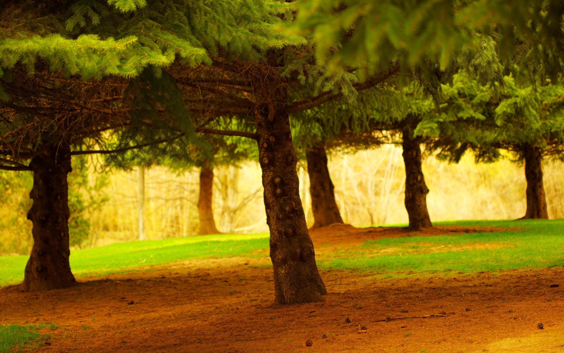 Drzewa iglaste o gęstej koronie. Jasny słoneczny dzień