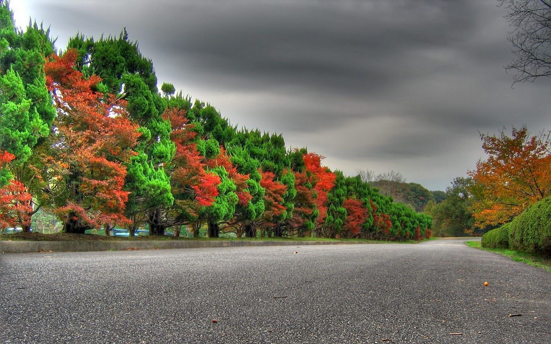 Aleja jesiennych drzew w oczekiwaniu na deszcz z ponurego nieba