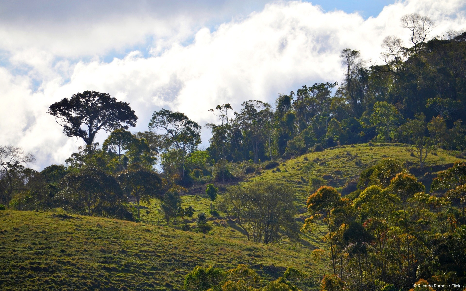 Zielone wzgórza, drzewa, chmury
