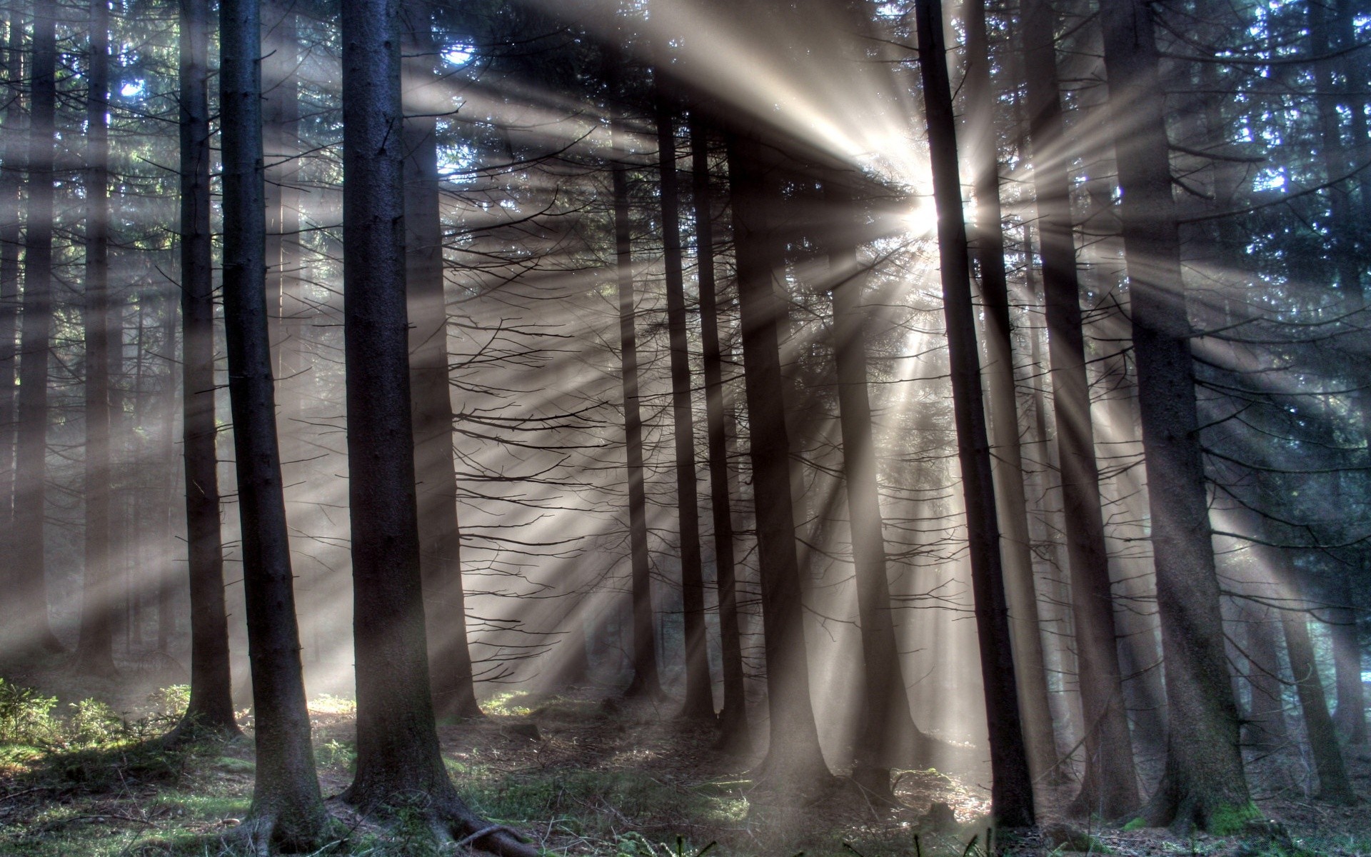 Uśpione drzewa na tle szarego jesiennego zachodu Słońca