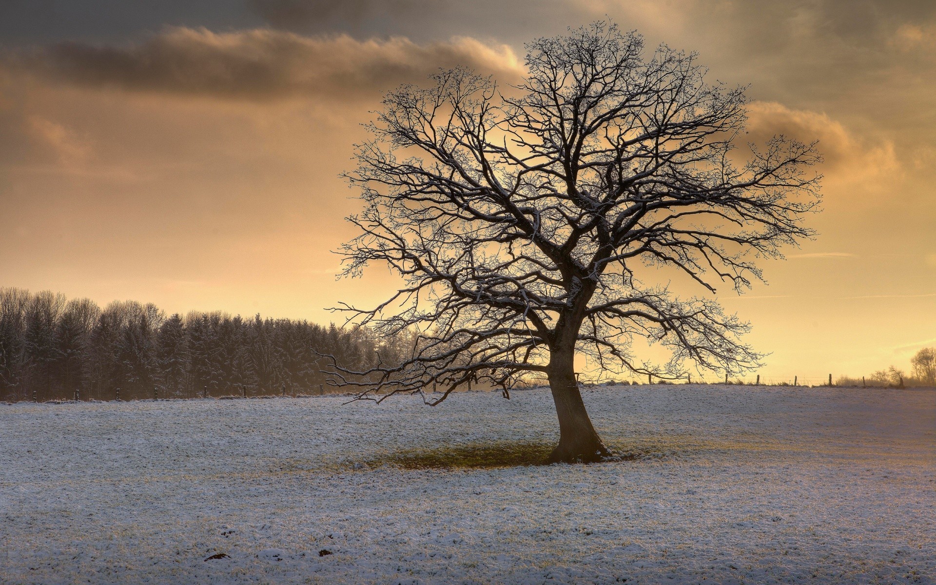 Zimowy zachód słońca i drzewo w śniegu