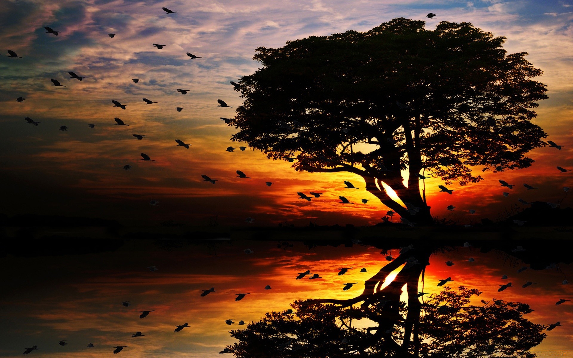 Krajobraz drzewo na tle nieba i zachodu Słońca