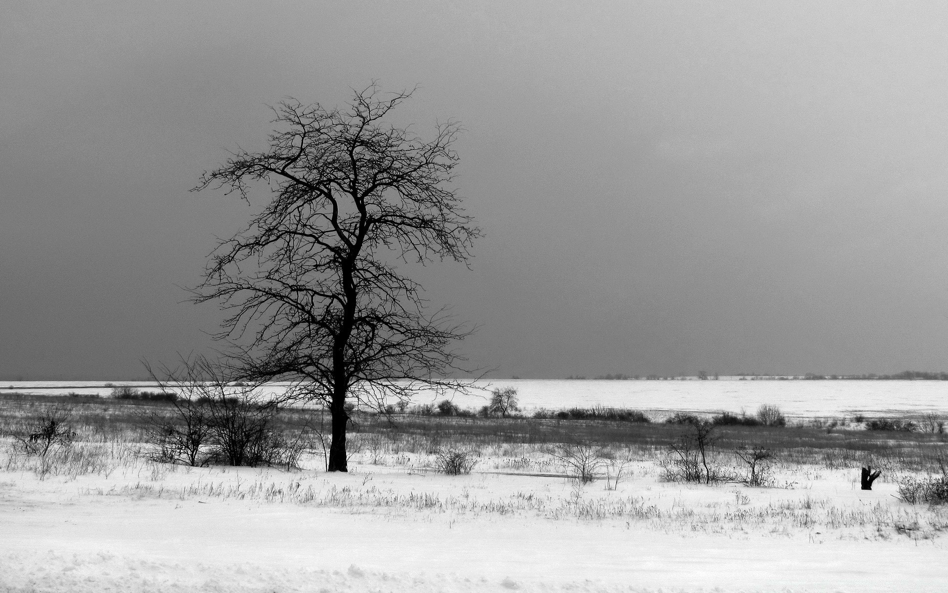 Drzewo w dolinie rzeki na tle zachodu Słońca