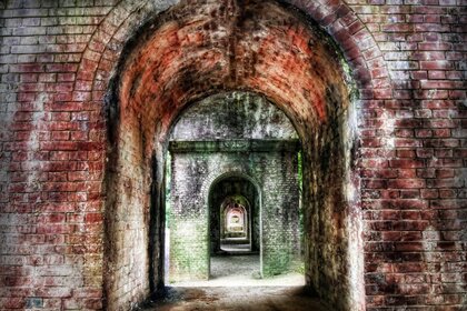 Przez sklepiony łuk zabytkowego domu z czerwonej cegłyPrzez sklepiony łuk zabytkowego domu z czerwonej cegły