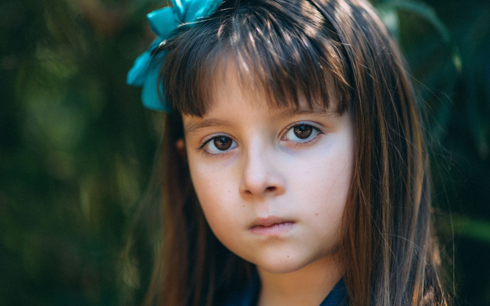 Lalka w dzianinowej zielonej czapce z ogromnymi zielonymi oczami